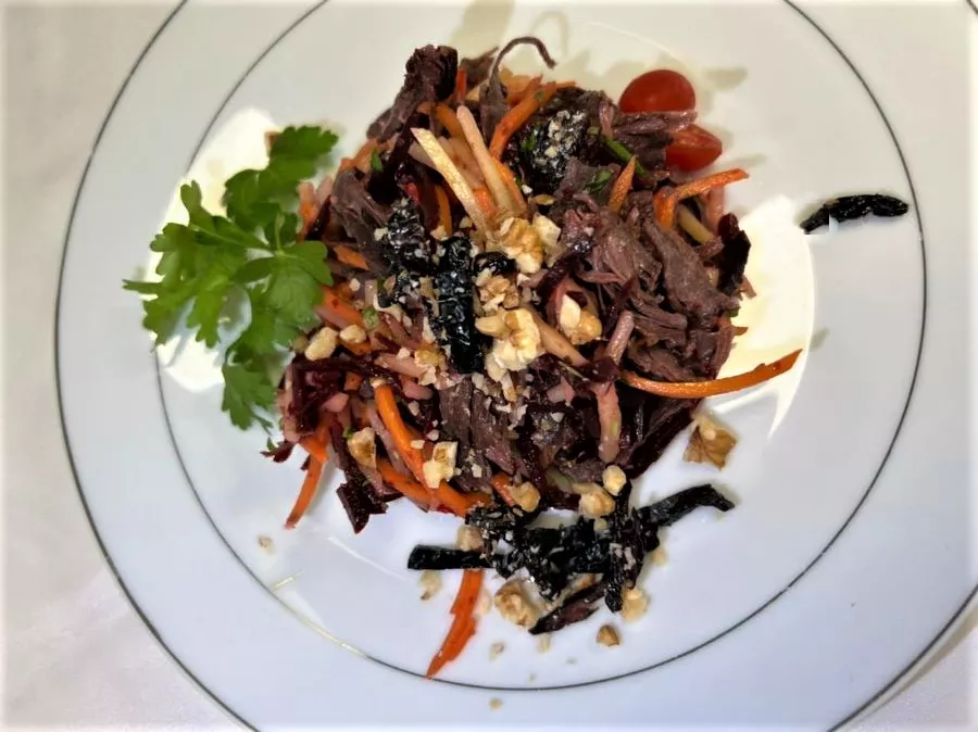 Мясо нащипать волокнами, свеклу и картофель натереть на крупной терке, морковь натереть на мелкой терке. Можно украсить грецкими орешками и черносливом.