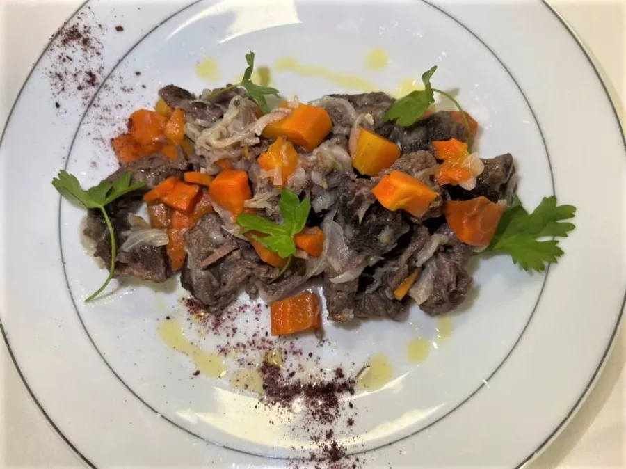 В широкой низкой кастрюле поджарить мелко нарезанный лук, затем добавить порезанную кубиками морковь, потом нарезанное кусочками 50 - 80 г посыпанное солью мясо (говядину), и обжарить его со всех сторон. Затем налить в кастрюлю кипящую воду так, чтобы она покрыла мясо и тушить на маленьком огне до готовности. За 10 - 15 мин до конца варки можно добавить нарезанный кусочками