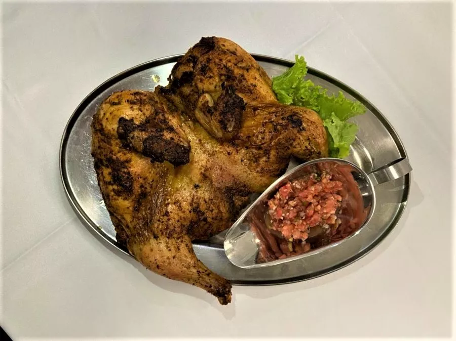 Тушку цыпленка выпотрошить, промыть, разрезать грудку вдоль, развернуть по разрезу. Хорошо отбить, не повреждая кожи, чтобы тушка приняла плоскую форму. Посолить, поперчить и положить на сковороду с разогретым маслом. Сверху на цыпленка положить крышку или плоскую тарелку, на которую поместить груз в 2 - 3 кг. Жарить до образования румяной корочки, сначала с одной, а потом с другой стороны (также под грузом). Время приготовления примерно 30 мин. На гарнир подать жареный картофель и немного зеленого горошка.