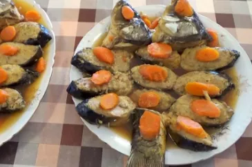 Карпа очистить от чешуи, отрезать голову и, не разрезая брюшка, вынуть внутренности, удалить из головы жабры, промыть холодной водой и нарезать рыбу поперечными кусками, толщиной 3 - 5 см. Из каждого куска рыбы вырезать мякоть, не повредив кожи. Для приготовления фарша мякоть вместе с луком и хлебом, намоченным в воде и отжатым, промолоть в комбайне. В фарш прибавить сырое яйцо, сахар, растительное масло, перец, соль и все тщательно перемешать. Приготовленным фаршем заполнить куски рыбы в тех местах, где была вырезана мякоть, и сравнять ножом, смоченным в воде. На дно кастрюли положить нарезанные кусочками свеклу и морковь, а также тщательно промытую луковую шелуху. Поверх овощей поместить фаршированные куски рыбы, на которые положить еще слой овощей, потом опять рыбу и снова слой овощей. Рыбу с овощами залить холодной водой так, чтобы вода только покрыла их, и, закрыв кастрюлю, поставить варить на слабый огонь 1.5 - 2 часа с момента закипания воды. Во время варки необходимо следить, чтобы рыба и овощи не пригорели, верхний слой рыбы надо изредка поливать образовавшимся бульоном. Перед подачей на стол рыбу вместе с овощами переложить на блюдо, оставшийся бульон процедить и полить им рыбу. Поставить в холодильник, чтобы бульон зажелировался.