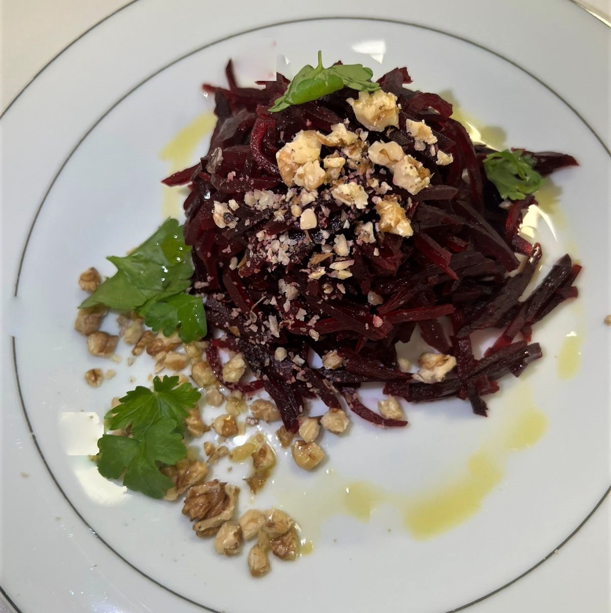 Свеклу натереть на крупной терке, добавить мелко нарезанные орехи и мелко натертый чеснок. Залить маслом и хорошо перемешать. Свеклу можно заменить тертой на мелкой терке сырой морковью. А также вместо масло использовать майонез.