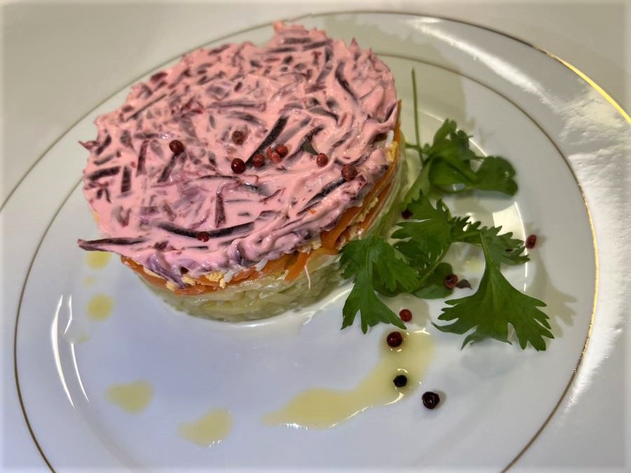 Чтобы придать торту необходимую форму, плотную бумагу сложить в 3-4 слоя, свернуть в ободок высотой 7-8 см., заколоть булавкой или скрепками. (Если есть разъемная тортовая форма, можно использовать ее). Бумажный ободок поместить на большое блюдо. Края блюда должны быть свободны на 2-3 см. Диаметр окружности, отделенной ободком, примерно 21-22 см. Свеклу испечь, картофель и морковь сварить в кожуре. Лук мелко нарезать, ошпарить, остудить, положить на полотенце, чтобы обсох, немного посолить. Яйца мелко порубить. Овощи укладывать в следующем порядке: огурец очистить, натереть на крупной терке и уложить ровным слоем на блюдо; 3 картофелины очистить, также потереть на крупной терке, уложить на огурец, немного полить майонезом; картофель прикрыть слоем одной натертой моркови; затем положить половину нарубленного лука; 2 рубленных яйца уложить на лук, полить майонезом; 1 яблоко, очищенное и натертое на крупной терке, поместить на яйца, немного полить майонезом; свеклу очистить, натереть на крупной терке, уложить поверх яблок (слой свеклы должен быть самым толстым). Обильно полить майонезом.