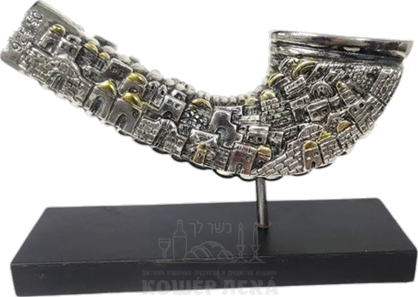 Шофар рам литейный, ненастоящий, посеребренный, с рисунком стен древнего Иерусалима - ru.kosherlekha.co.il