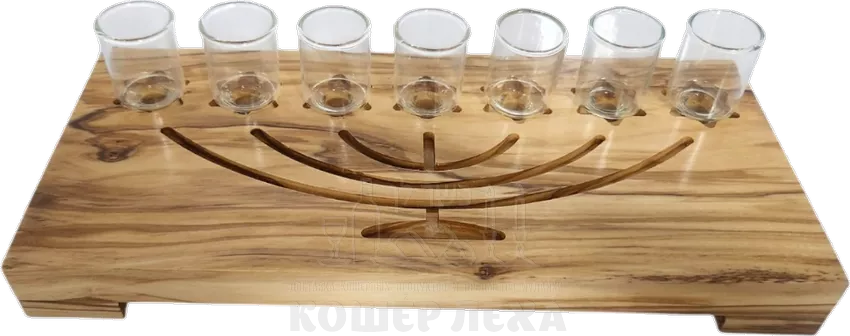 Менора из оливкового дерева с гравировкой в виде меноры и стеклянными чашками ручной работы - ru.kosherlekha.co.il