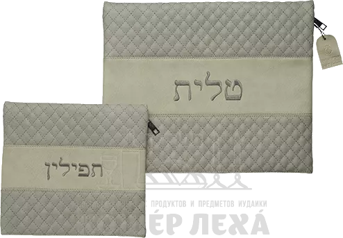 Комплект для талита и тфилина кожаный серый с бежевой полосой - ru.kosherlekha.co.il
