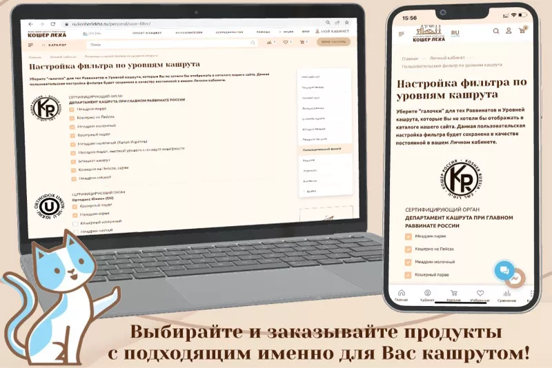 Для того, чтобы воспользоваться индивидуальным фильтром, Вам нужно зайти в свой личный кабинет на нашем сайте kosherlekha.co.il. Там есть специальный раздел «Пользовательский фильтр» https://ru.kosherlekha.co.il/personal/user-filter/, где Вы можете установить «галочки» для уровней кашрута, которые Вы хотите видеть на сайте, остальные продукты с прочими уровнями кашрута не будут отображаться в каталоге. Надеемся, что эта новая функция Вам понравится!