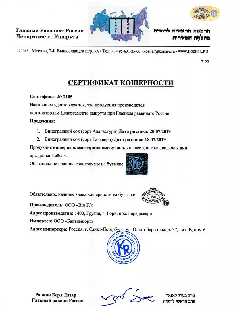 Сок«GreenKosher» был создан под наблюдением департамента кашрута при Главном раввинате России под руководством главного раввина России Берл Лазара.