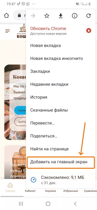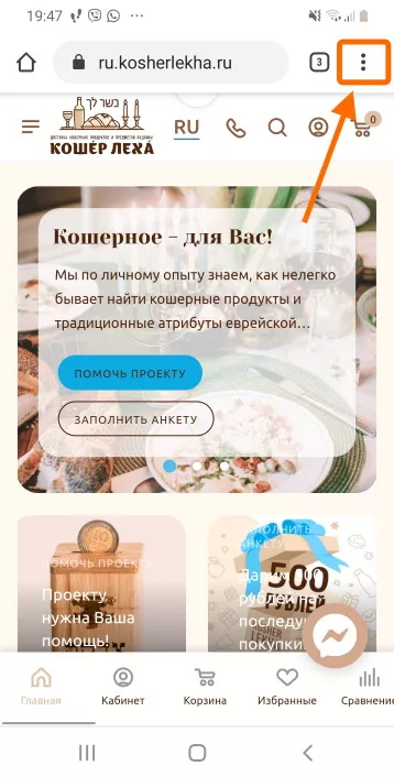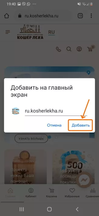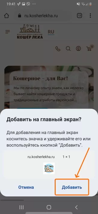 Добавление сайта kosherlekha.co.il в виде «имитации приложения» на главный экран в Android.
