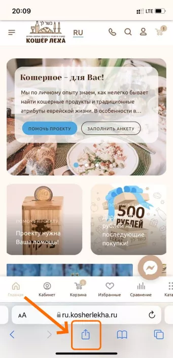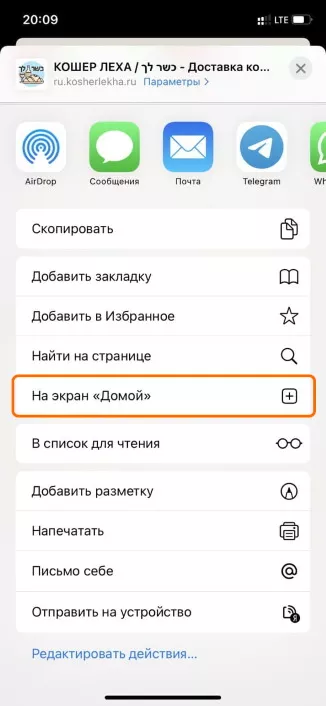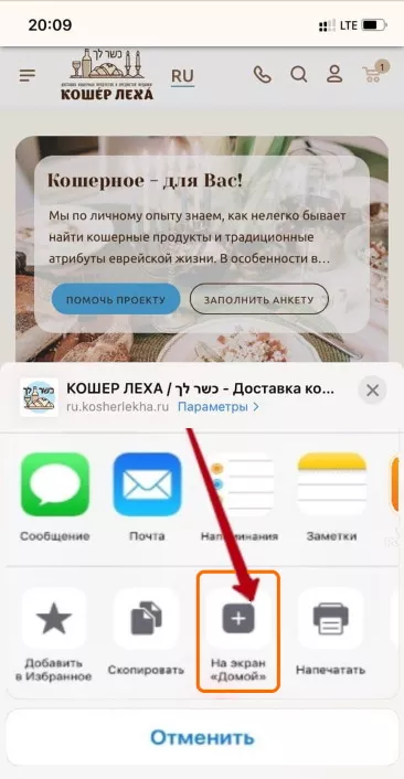 В Apple iOS установить сайт kosherlekha.co.il как Веб-приложение можно из контекстного меню браузера Safari. Откройте сайт в браузере Safari на мобильном устройстве. После этого в браузере необходимо нажать на кнопку "Поделиться" и выбрать пункт "Добавить на экран "Домой".