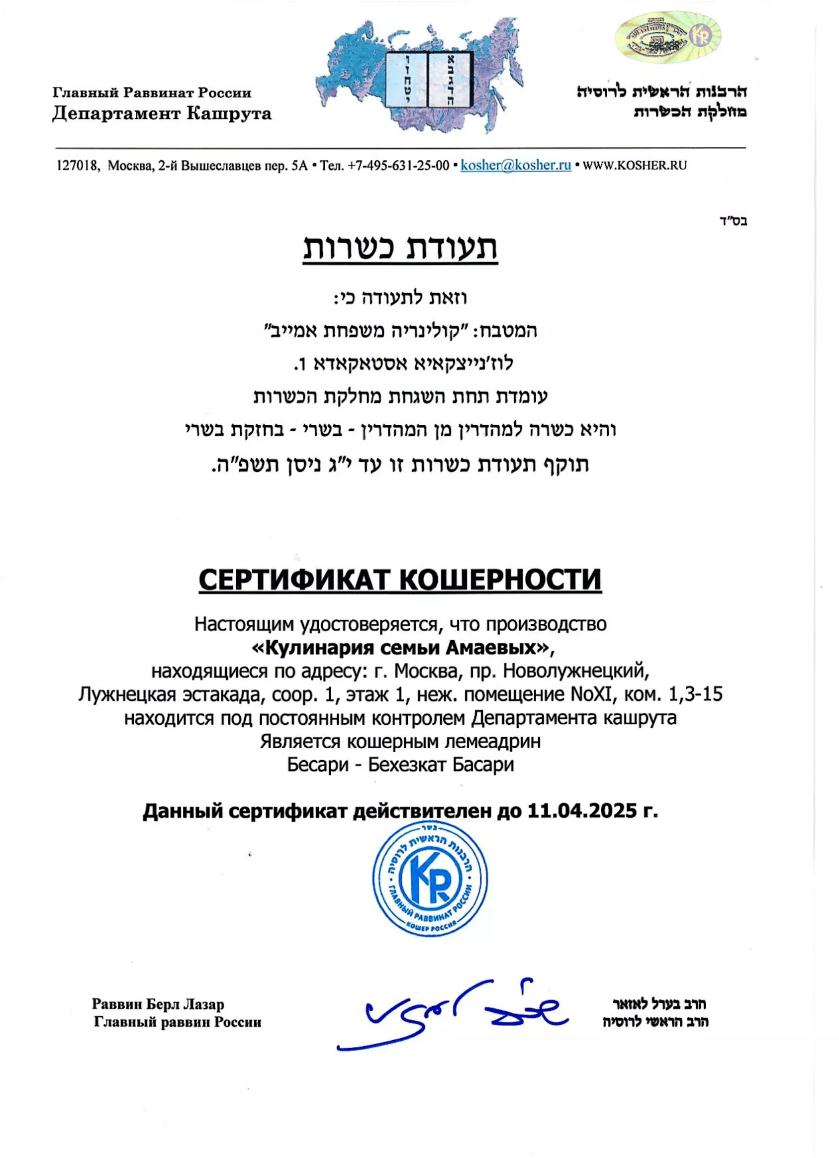 Единственная официально зарегистрированная организация в Российской Федерации оказывающая услуги по кошер-сертификации продуктов питания в соответствии с международными стандартами.